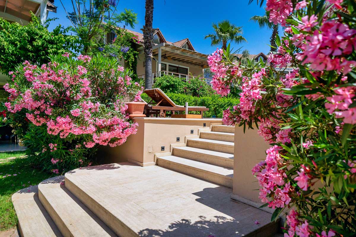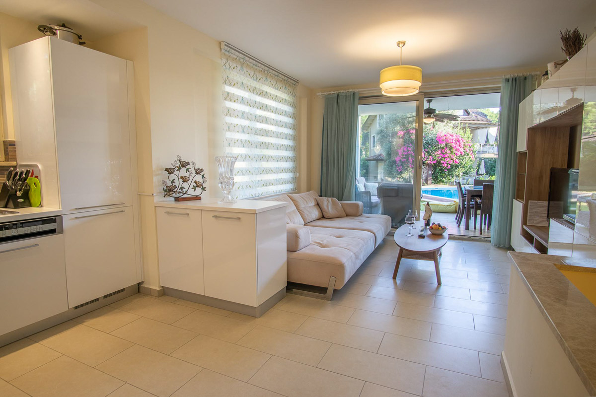 Göcek Aquamarine Sitesinde kiralık bir dairede yaşamanın en önemli avantajlarından biri, araç kullanmadan günlük ihtiyaçlara ulaşabilmek oluyor. 5.000 m² arazi üzerine kurulu sitede portakal ve palmiye ağaçları arasında konumlanan geniş bir yüzme havuzu, otopark alanı ve güvenlik sistemi yer alıyor.