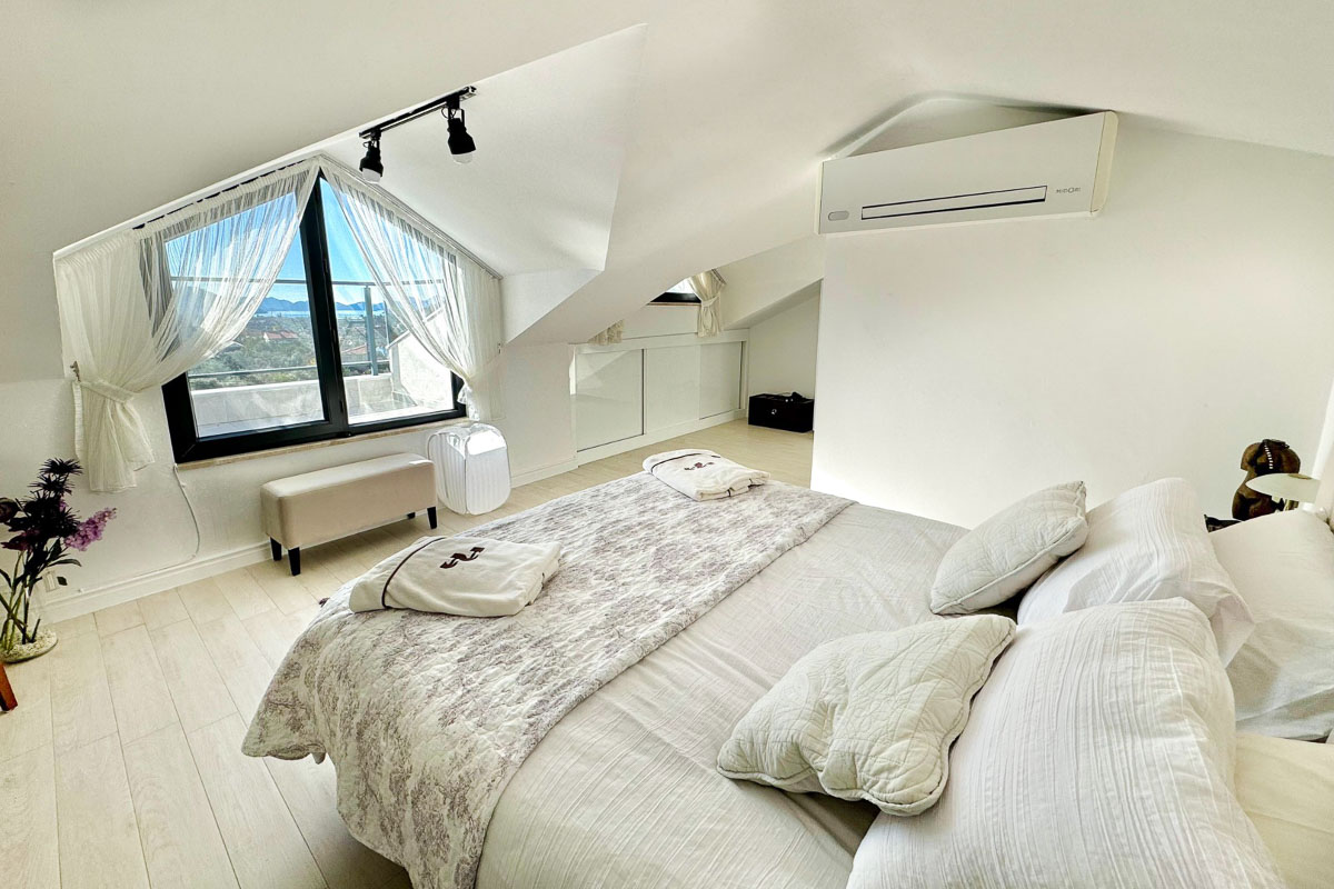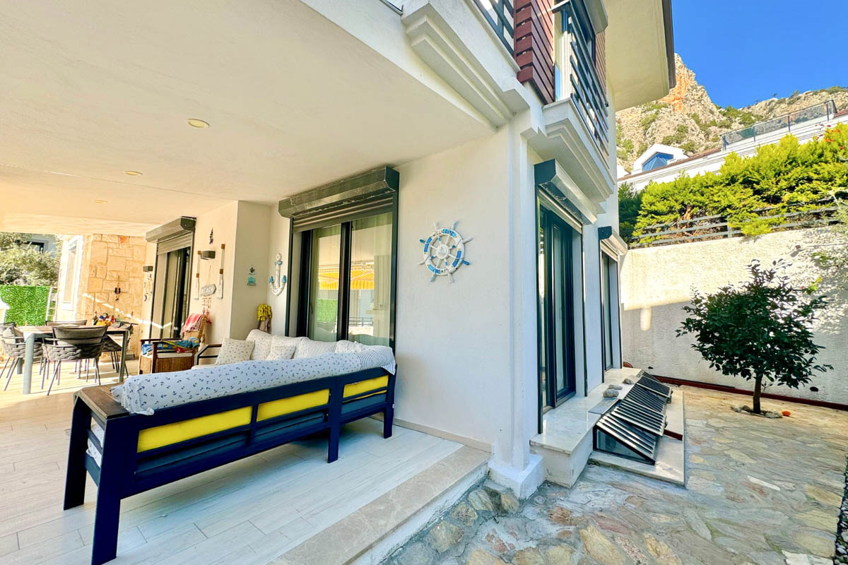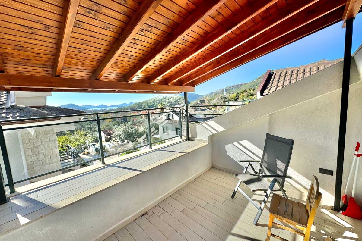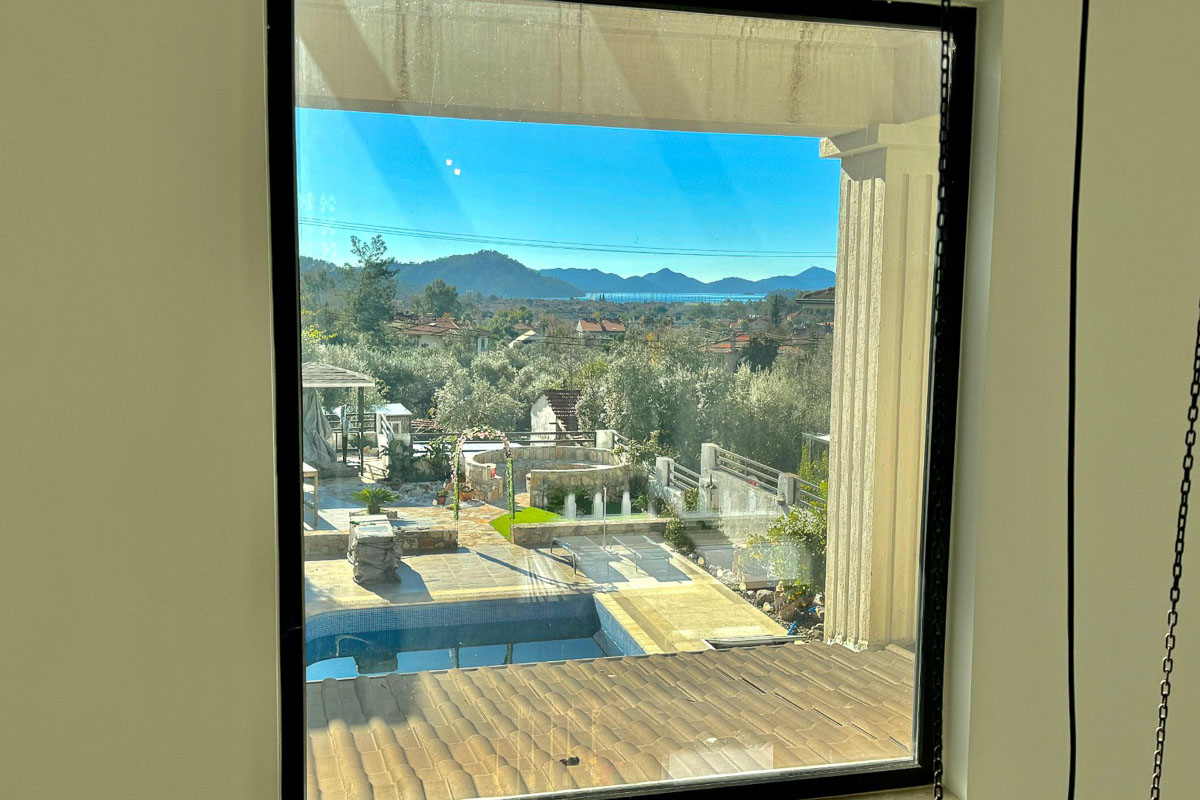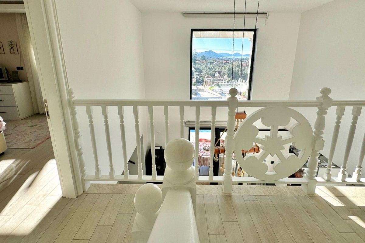 Göcek çarşı ve D-Marin’e yaklaşık 5 dakikalık sürüş mesafesinde, ormanla iç içe sakin bir konumda yer alan bu müstakil villa, deniz manzarasını doğanın yeşil dokusuyla bir araya getiriyor. Ağaçların arasındaki huzurlu atmosfer, geniş bahçe kullanımı ve akıllı ev altyapısıyla birlikte modern konforu doğanın içinde konumlandırıyor. Sadece bahçeden değil, evin tüm katlarından izlenebilen deniz manzarası yapının karakterini belirleyen en güçlü detaylardan biri.