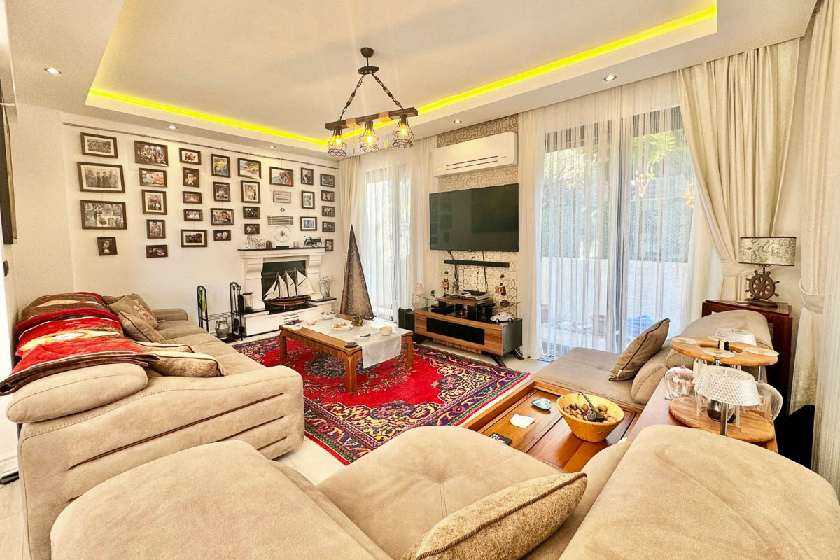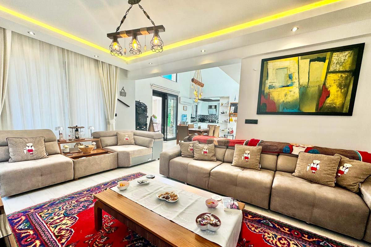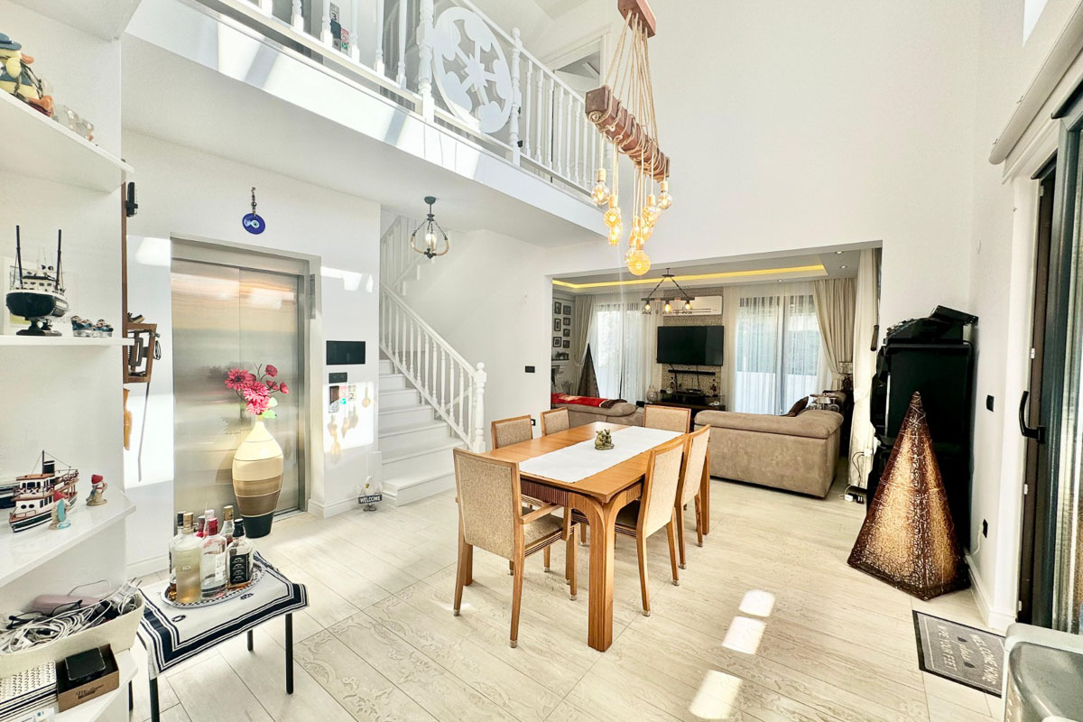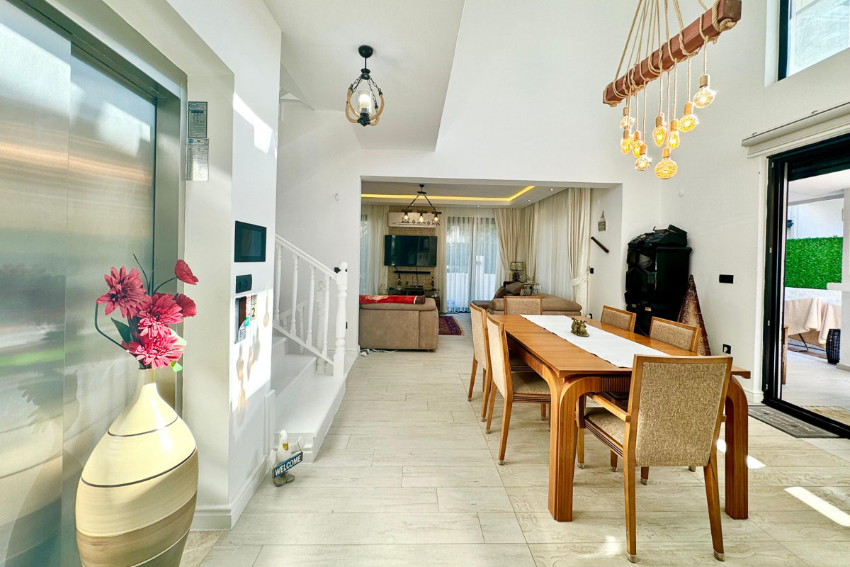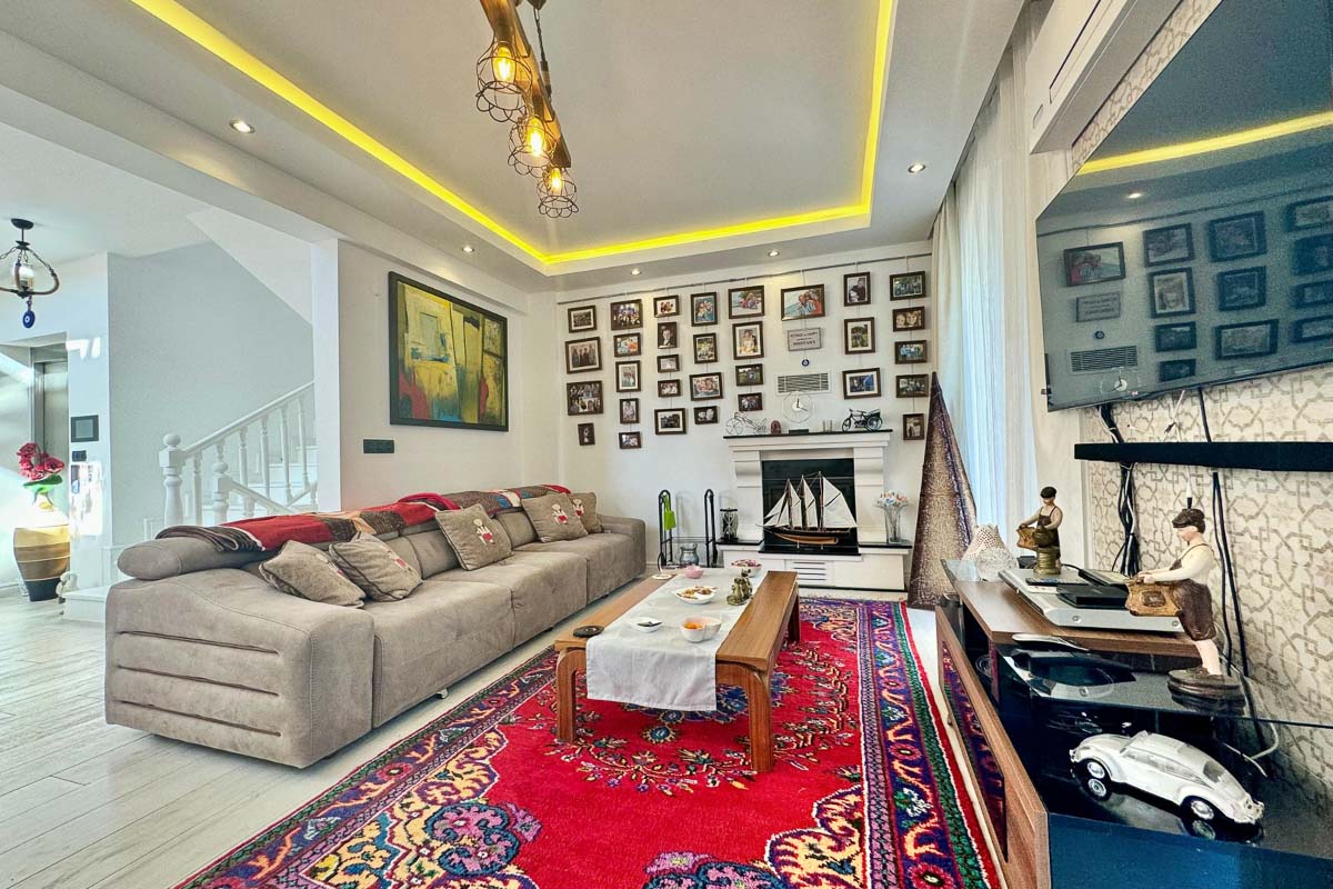 220 m² kullanım alanına sahip olan villa, beyaz eşyalar dahil tam donanımlı ve eşyalı şekilde teslim ediliyor. Evde asansör sistemi yer alıyor ve tüm katlara ulaşım oldukça pratik. Her odada klima bulunuyor, yerden ısıtma ve soğutma sistemi yılın her döneminde dengeli bir konfor sağlıyor. Salonun merkezinde yer alan şömine, serin akşamlarda sıcak bir atmosfer oluşturuyor. Kuvars tezgahlı modern mutfak, elektrikli panjurlar, güvenlik kameraları ve güvenli giriş kapısı donanımı tamamlıyor. İki araçlık özel otopark alanı mevcut.