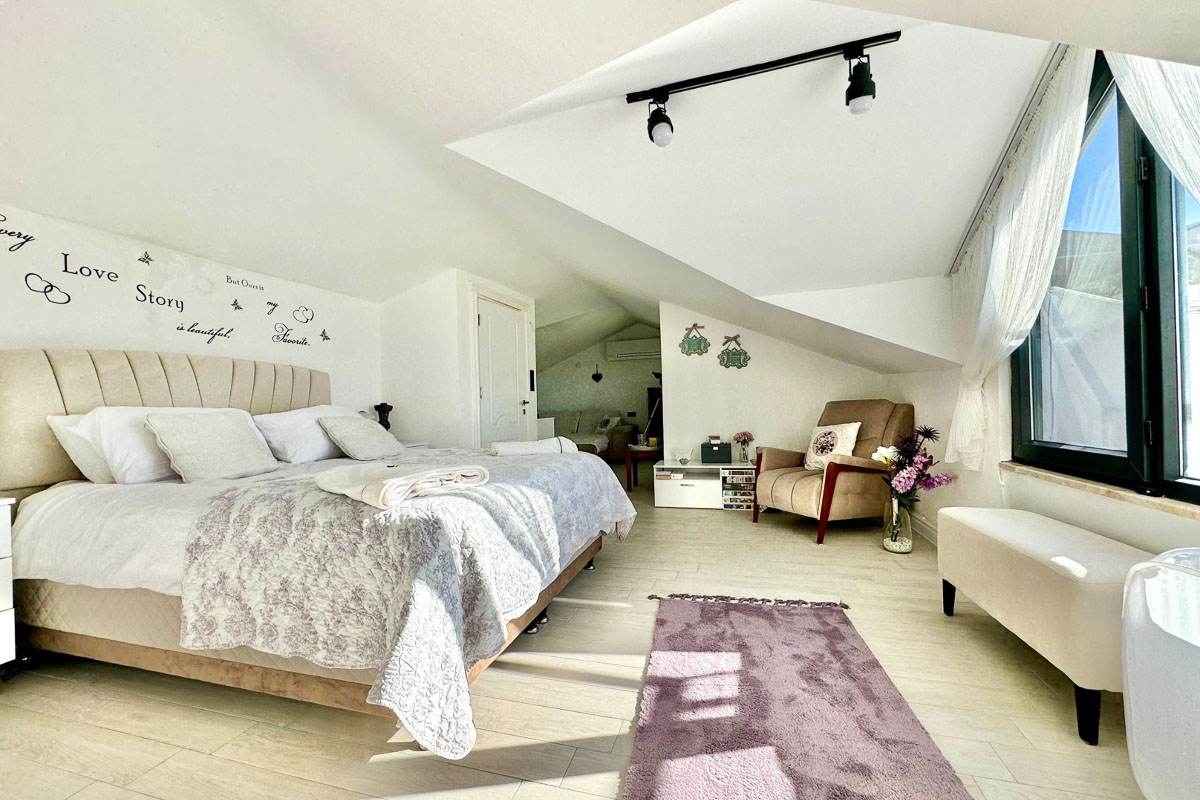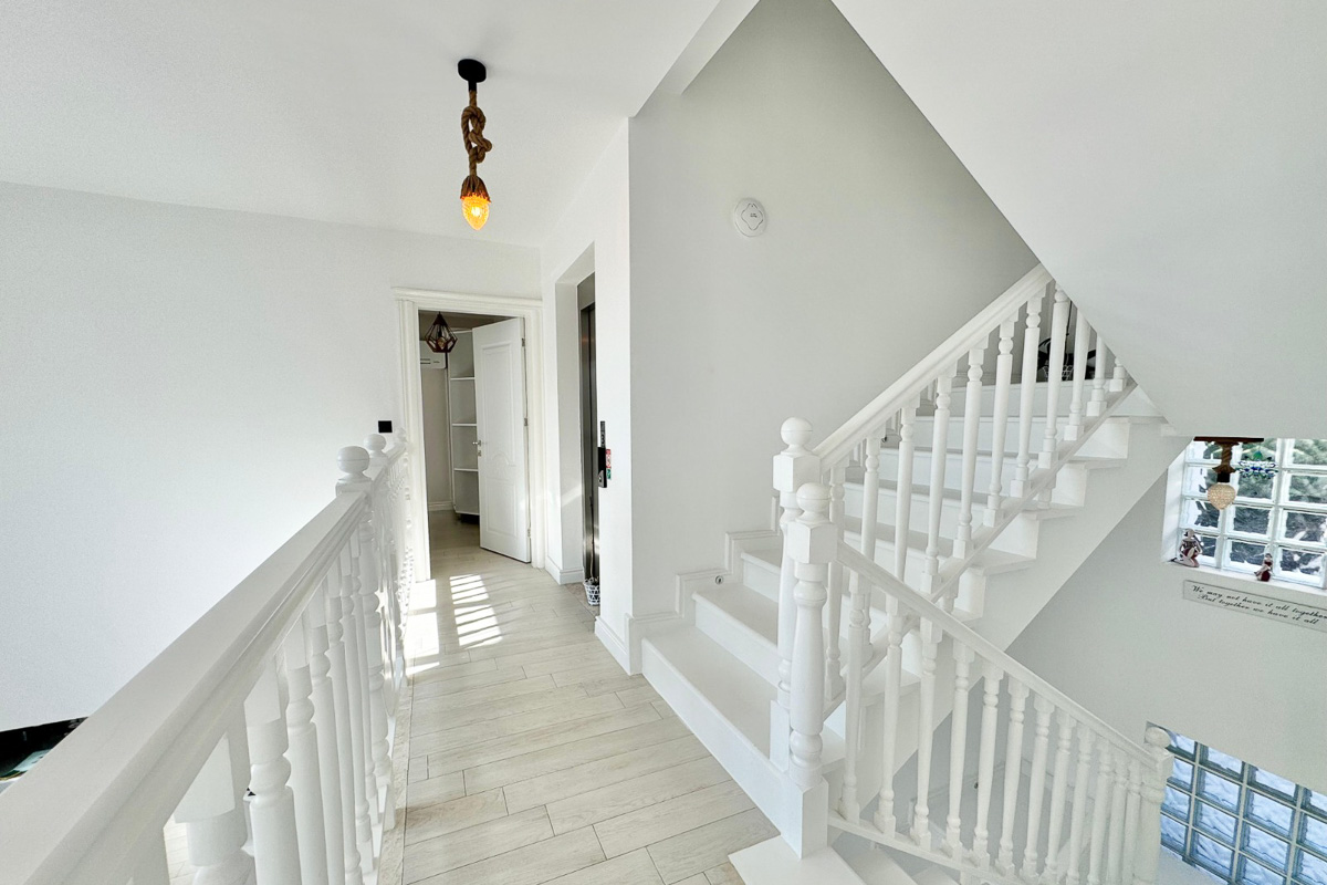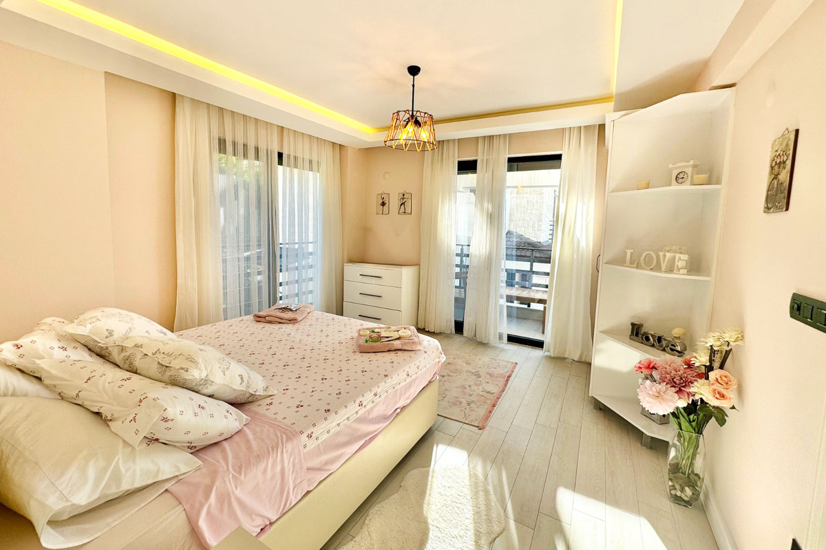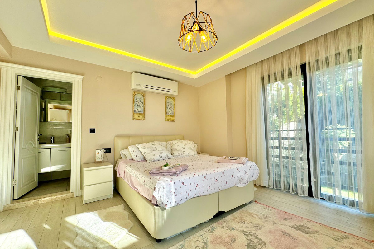 220 m² kullanım alanına sahip olan villa, beyaz eşyalar dahil tam donanımlı ve eşyalı şekilde teslim ediliyor. Evde asansör sistemi yer alıyor ve tüm katlara ulaşım oldukça pratik. Her odada klima bulunuyor, yerden ısıtma ve soğutma sistemi yılın her döneminde dengeli bir konfor sağlıyor. Salonun merkezinde yer alan şömine, serin akşamlarda sıcak bir atmosfer oluşturuyor. Kuvars tezgahlı modern mutfak, elektrikli panjurlar, güvenlik kameraları ve güvenli giriş kapısı donanımı tamamlıyor. İki araçlık özel otopark alanı mevcut.