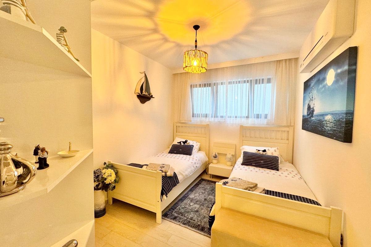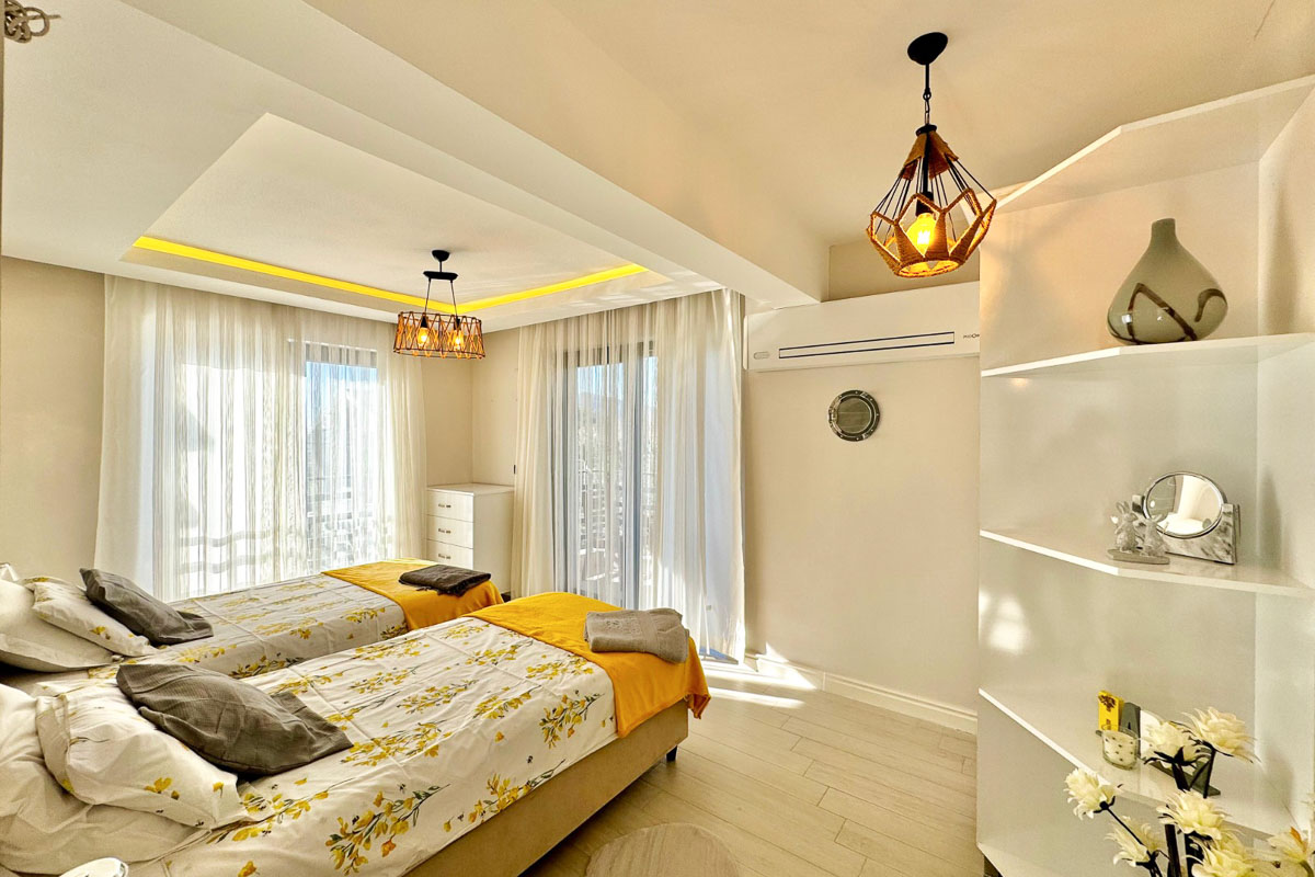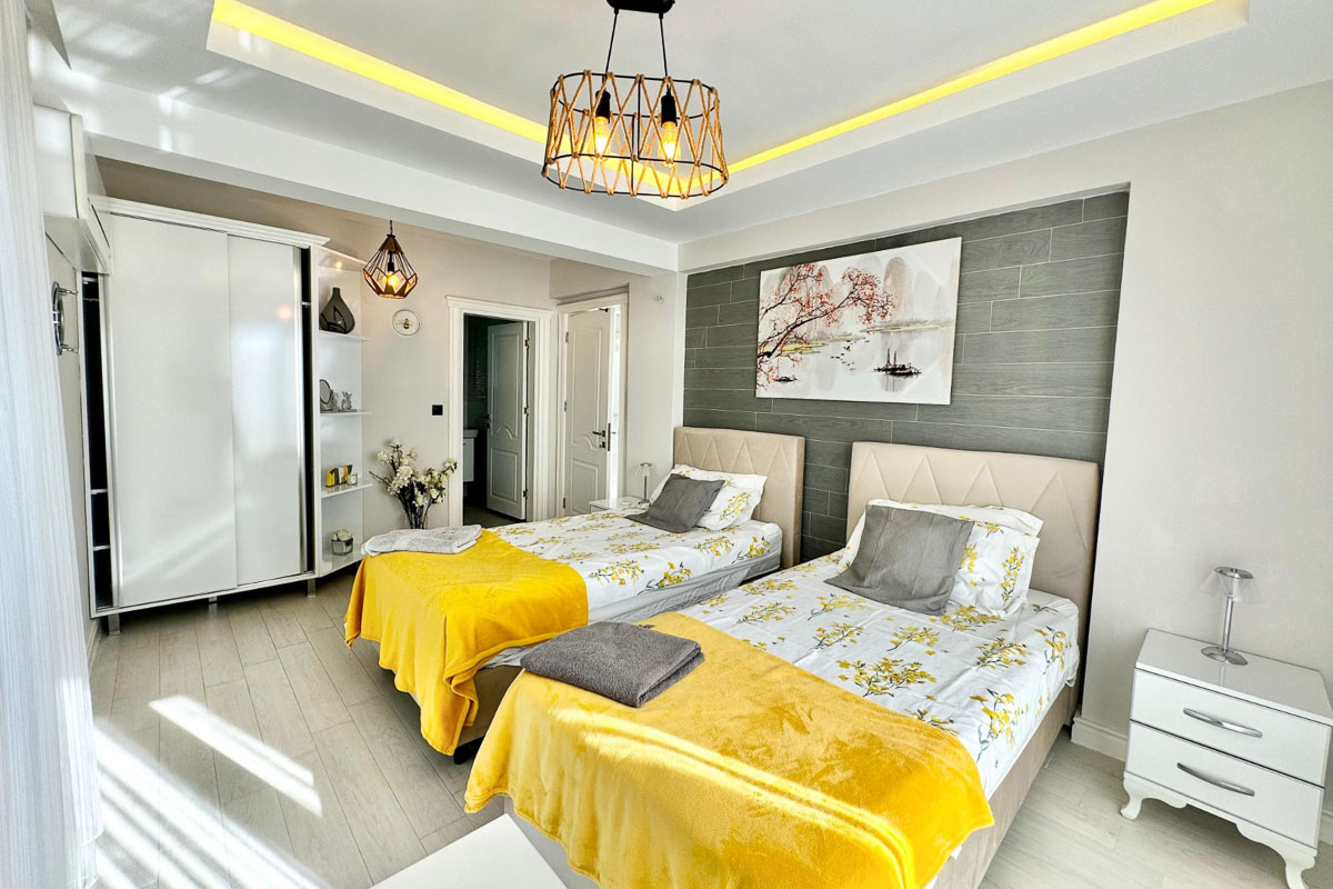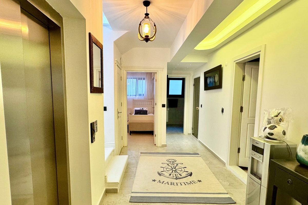 Toplam 5 oda ve 4 banyodan oluşan villanın kat planı dengeli ve fonksiyonel bir kullanım sunuyor. En alt katta sauna, Türk hamamı, depolama alanları, biri çift kişilik diğeri iki yataklı iki oda ve ortak banyo yer alıyor. Giriş katında açık plan mutfak ve salon doğrudan havuz ve deniz manzaralı geniş balkona açılıyor. Bu katta ayrıca misafir WC ve gömme dolap alanları bulunuyor. Birinci katta her biri ebeveyn banyolu ve özel balkonlu iki yatak odası yer alıyor. En üst katta ise tamamen ayrı bir yaşam alanı sunan master suit bulunuyor; kendine ait salonu, yatak alanı ve esnek kullanımlı ek odası ile daha izole bir yaşam alanı oluşturuyor.