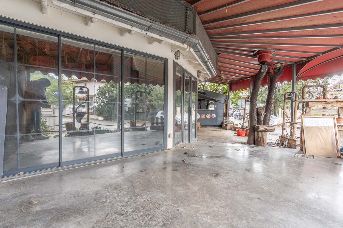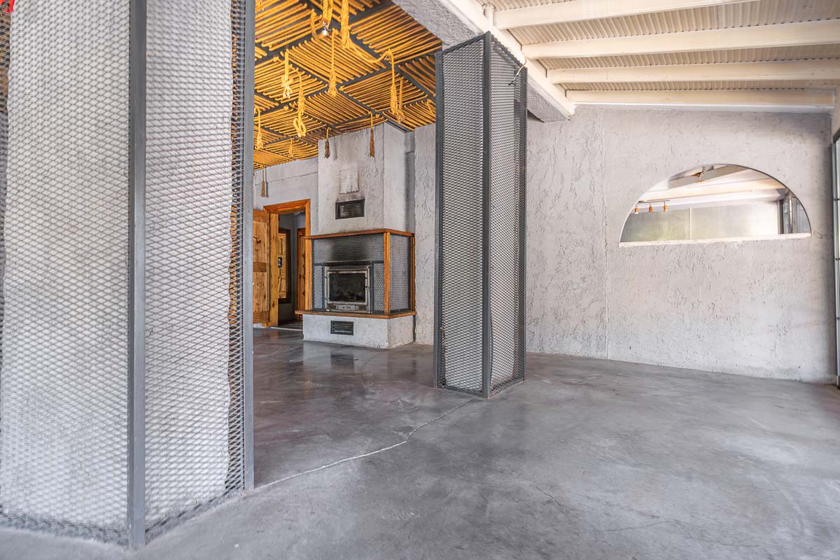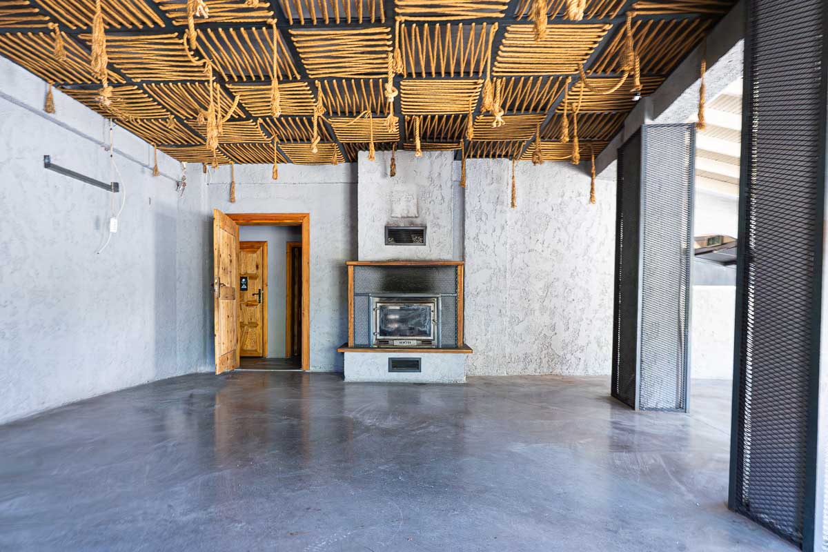 Beton dokulu duvarlar, antrasit metal doğramalar ve şömine detaylı iç mekan, markanıza modern bir kimlik kazandırıyor. Ön cephedeki geniş veranda, açık hava kullanımı gerektiren iş modelleri için konforlu bir alan oluşturuyor.