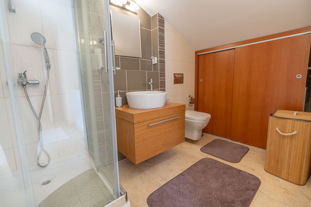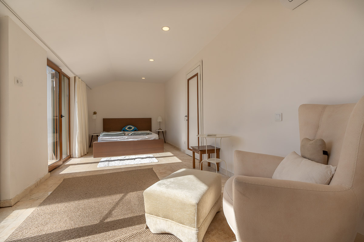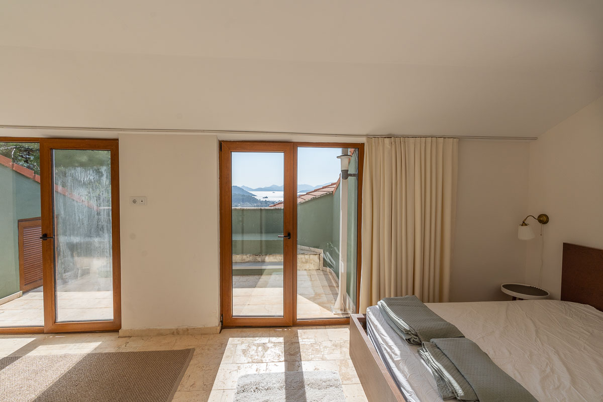 • Üst Kat: Biri öne, diğeri arka cepheye bakan iki yatak odası ve ortak bir banyo bulunuyor. Özellikle ön cephedeki ana yatak odası, genişliği ve yatağınızdan bile izleyebileceğiniz muazzam deniz manzarasıyla öne çıkıyor.