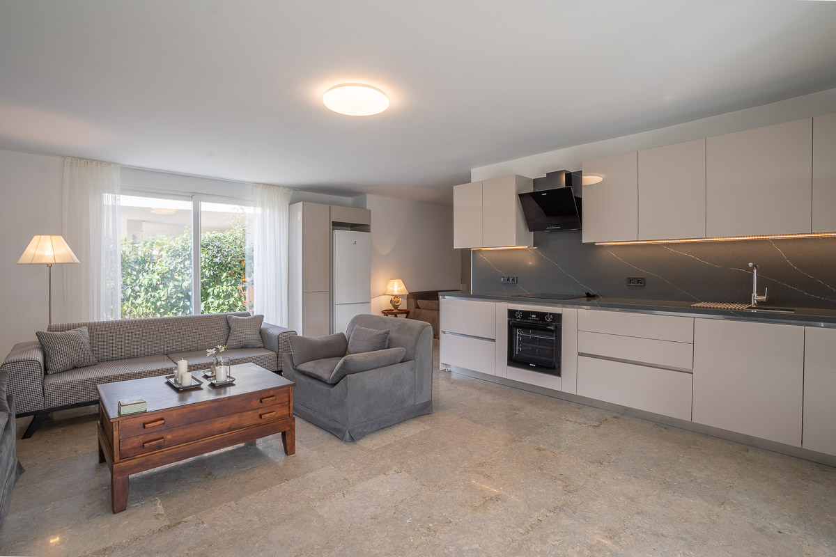 Açık planlı mutfağa sahip geniş salon, doğal ışıkla dolu ferah bir atmosfere sahip. Salonun hemen yanındaki verandadan, özel havuza ve yemyeşil bahçeye geçiş yapılabiliyor.