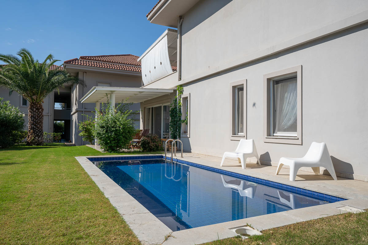 Doğal malzemelerin özenle kullanıldığı iç mekan, Akdeniz mimarisinin sıcak dokusunu modern konforla birleştiriyor. Evde fan coil ısıtma sistemi, termofon, fiber internet, özel bahçe, özel havuz ve ortak tuzlu su havuzu gibi donanımlar bulunuyor.