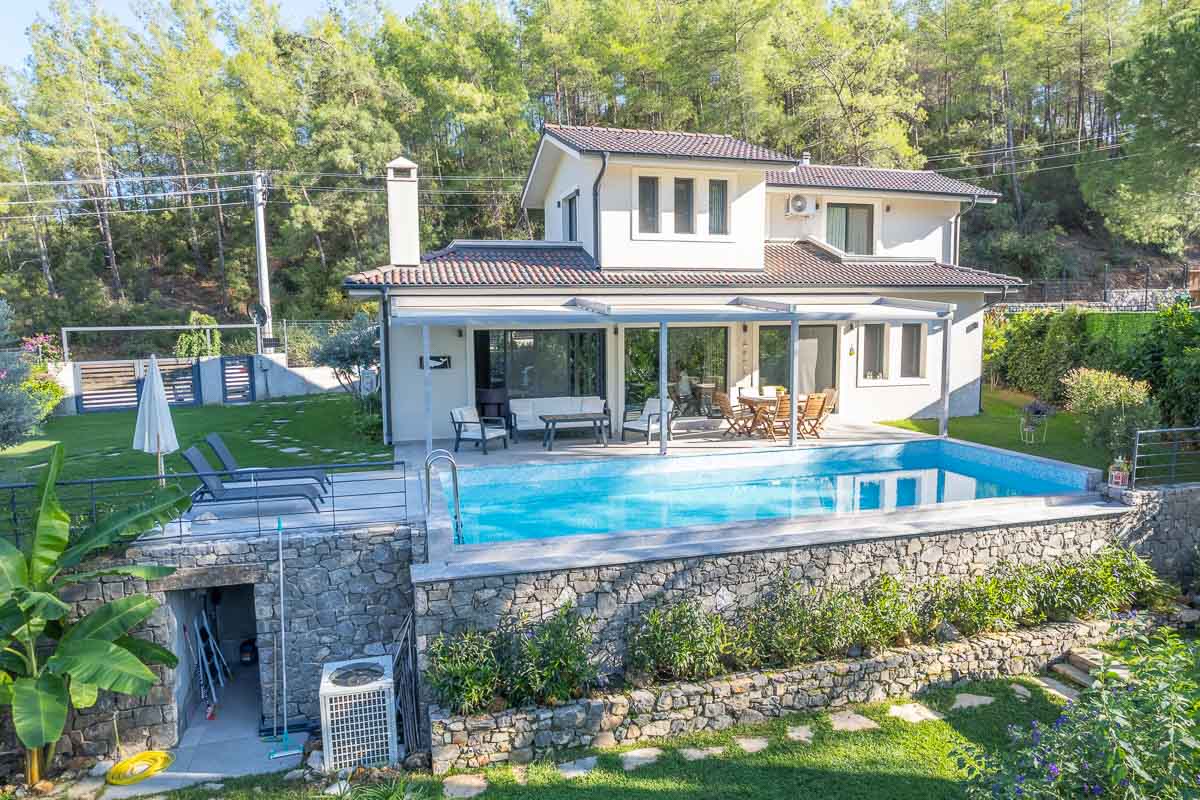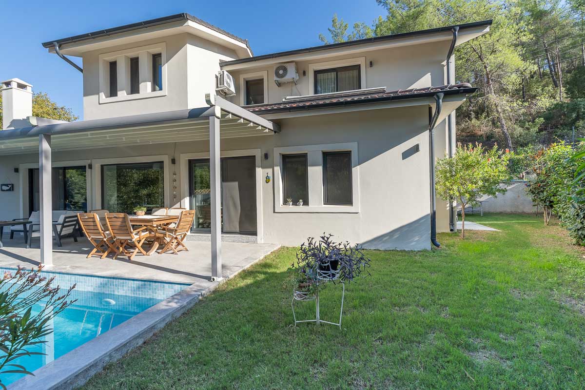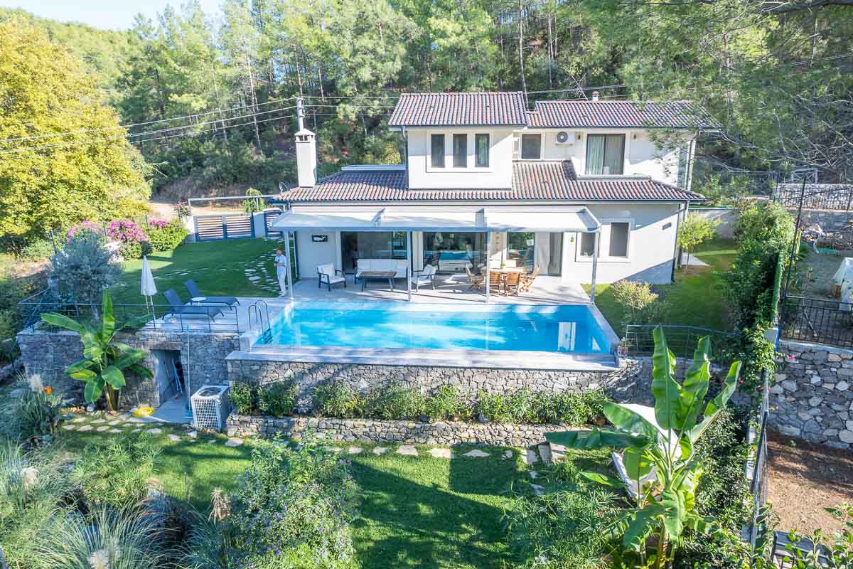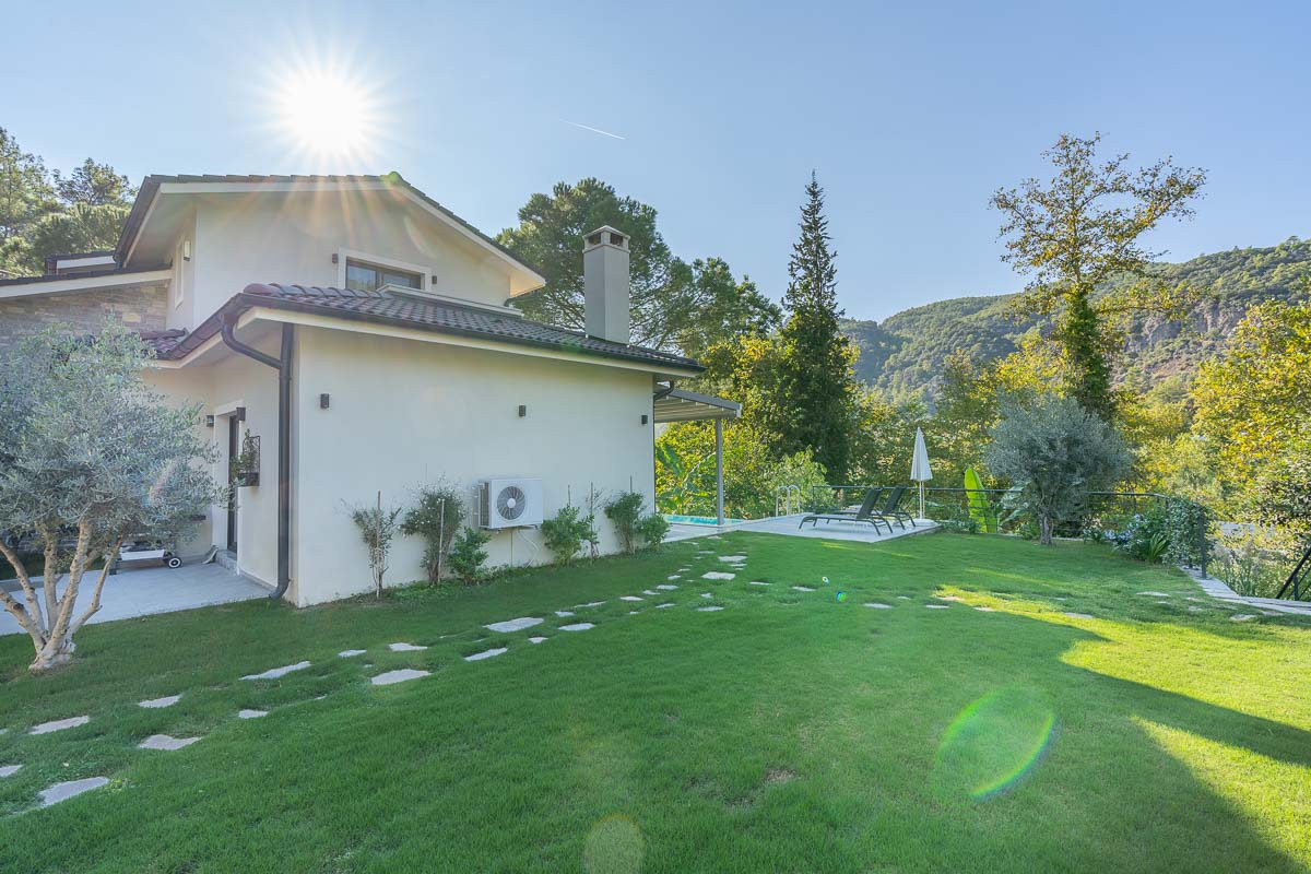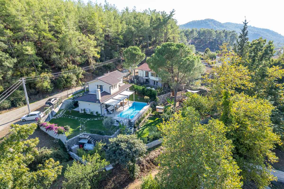 İnlice’de, yemyeşil bir vadi içerisinde konumlanan bu müstakil villa, doğa ile iç içe ve sakin bir yaşam arayanlar için dengeli bir seçenek oluşturuyor. Yaklaşık 700 m² arsa üzerine inşa edilmiş olan mülk, geniş bahçesi, özel havuzu ve çevresini saran çam ormanları ile huzurlu bir atmosfer sunuyor.