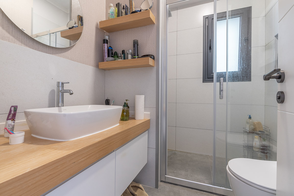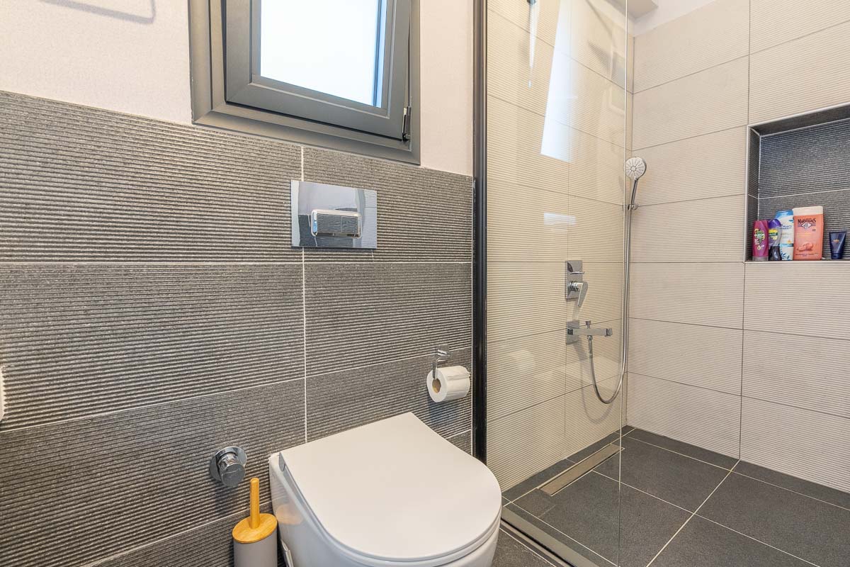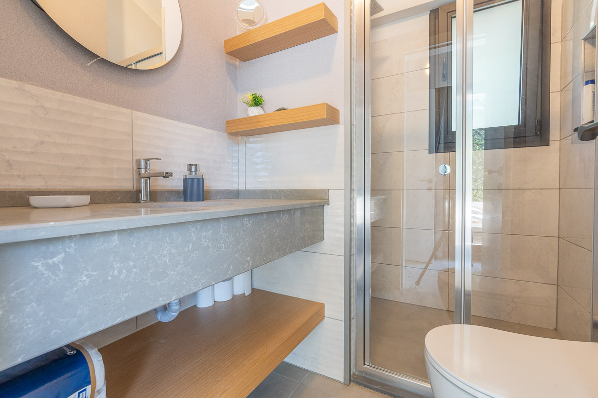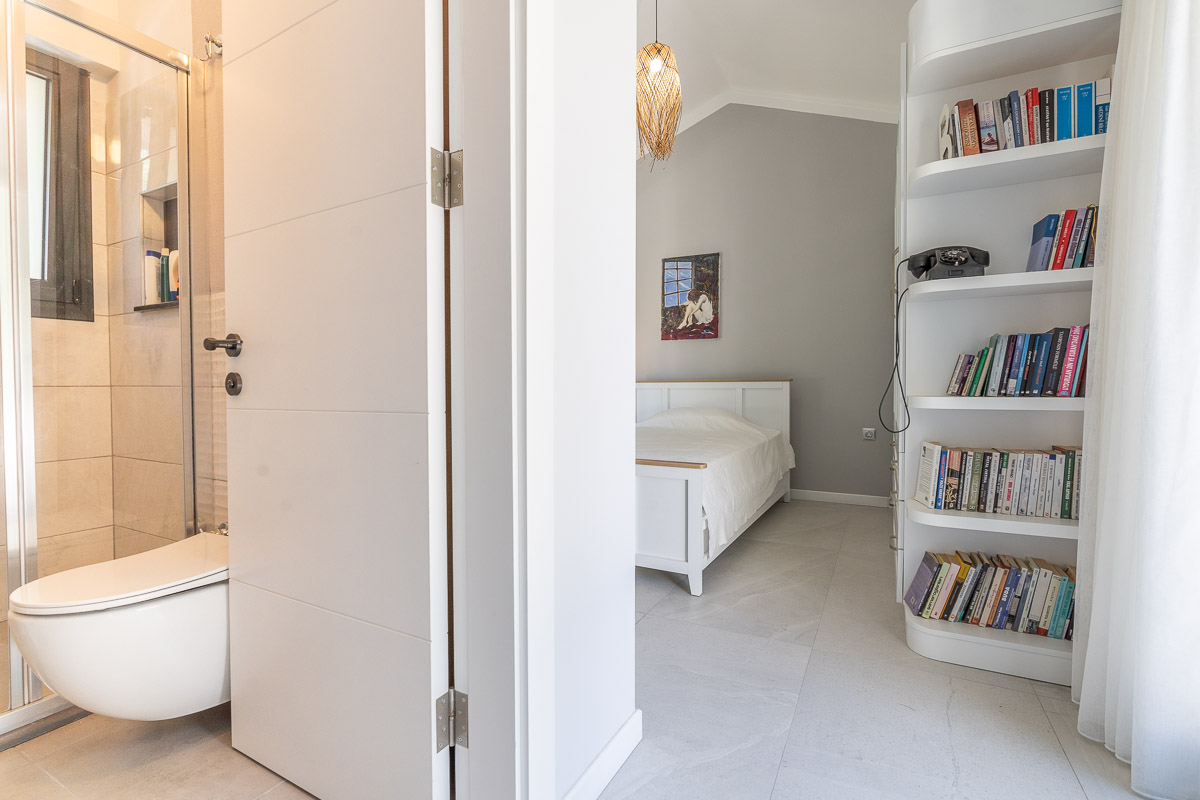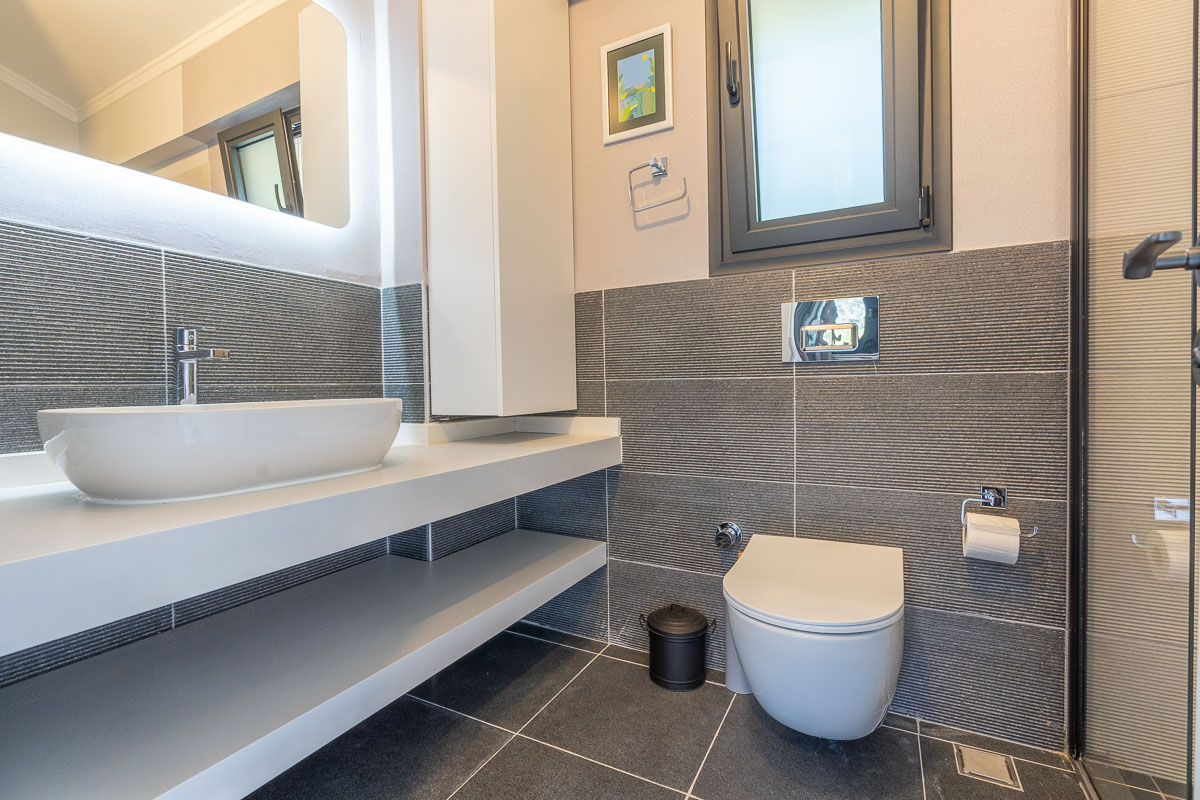Toplamda 200 m² brüt, yaklaşık 140 m² net kullanım alanına sahip olan villa iki katlı olarak tasarlanmış. Arazinin doğal eğimi planlamada iyi değerlendirilmiş olup, giriş seviyesinden aşağı inildiğinde salon ve mutfağın bulunduğu yaşam alanına ulaşılıyor. Bu bahçe katında açık plan mutfak, geniş bir salon, ebeveyn banyolu bir master yatak odası ve bir çocuk odası yer alıyor. Aynı katta misafir kullanımı için ortak bir banyo da bulunuyor.
