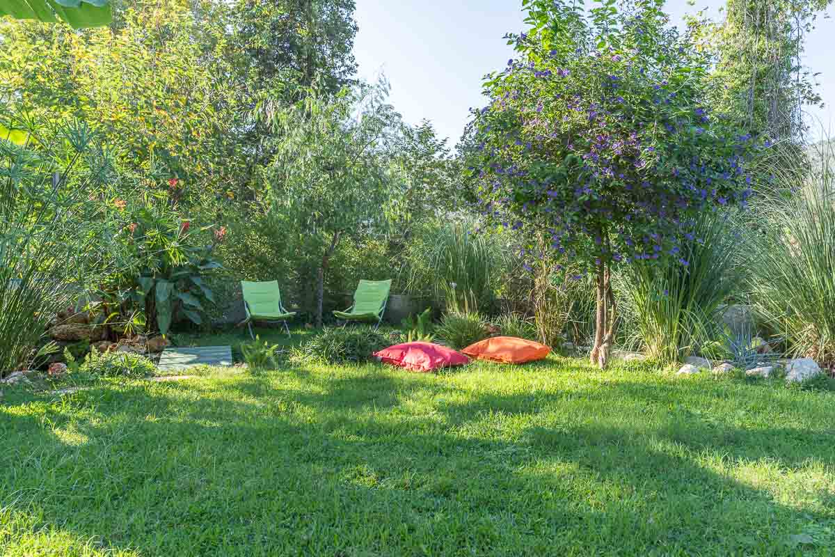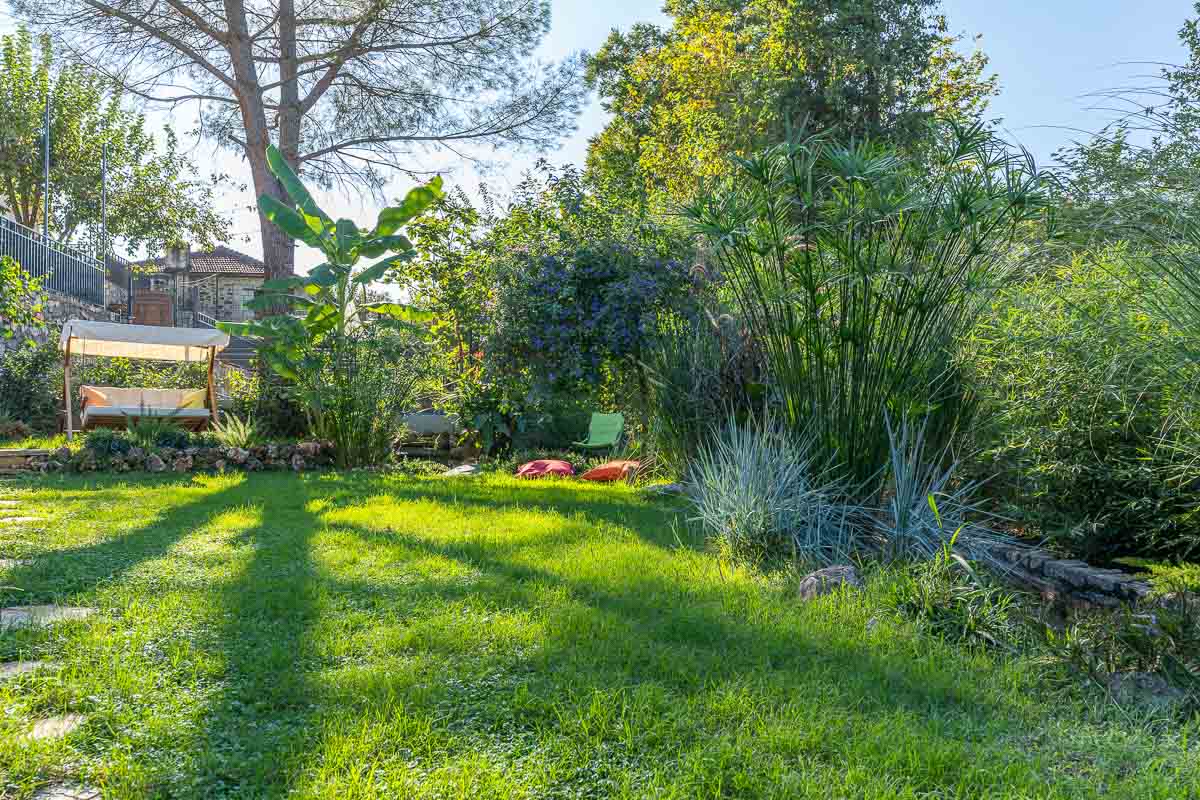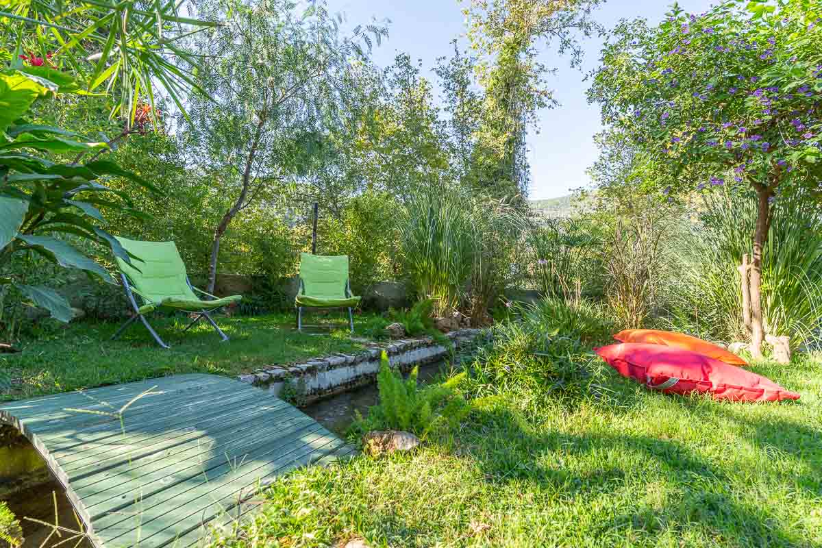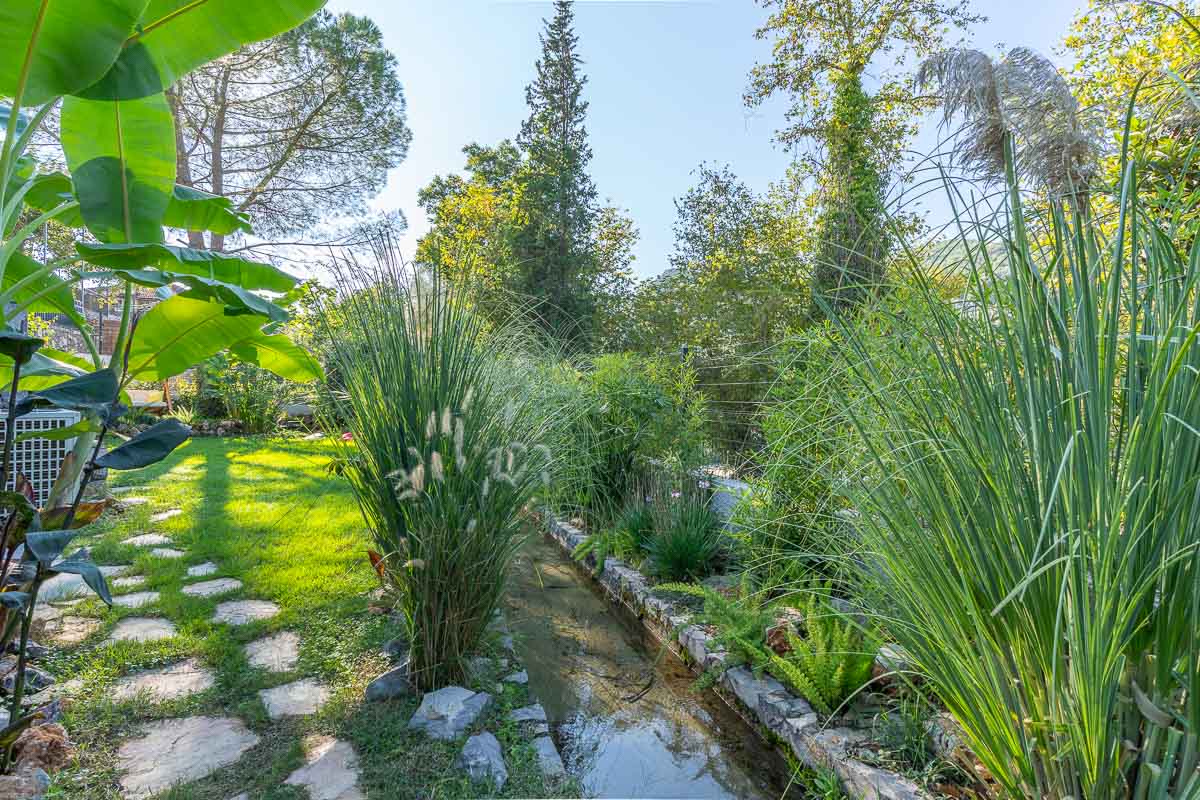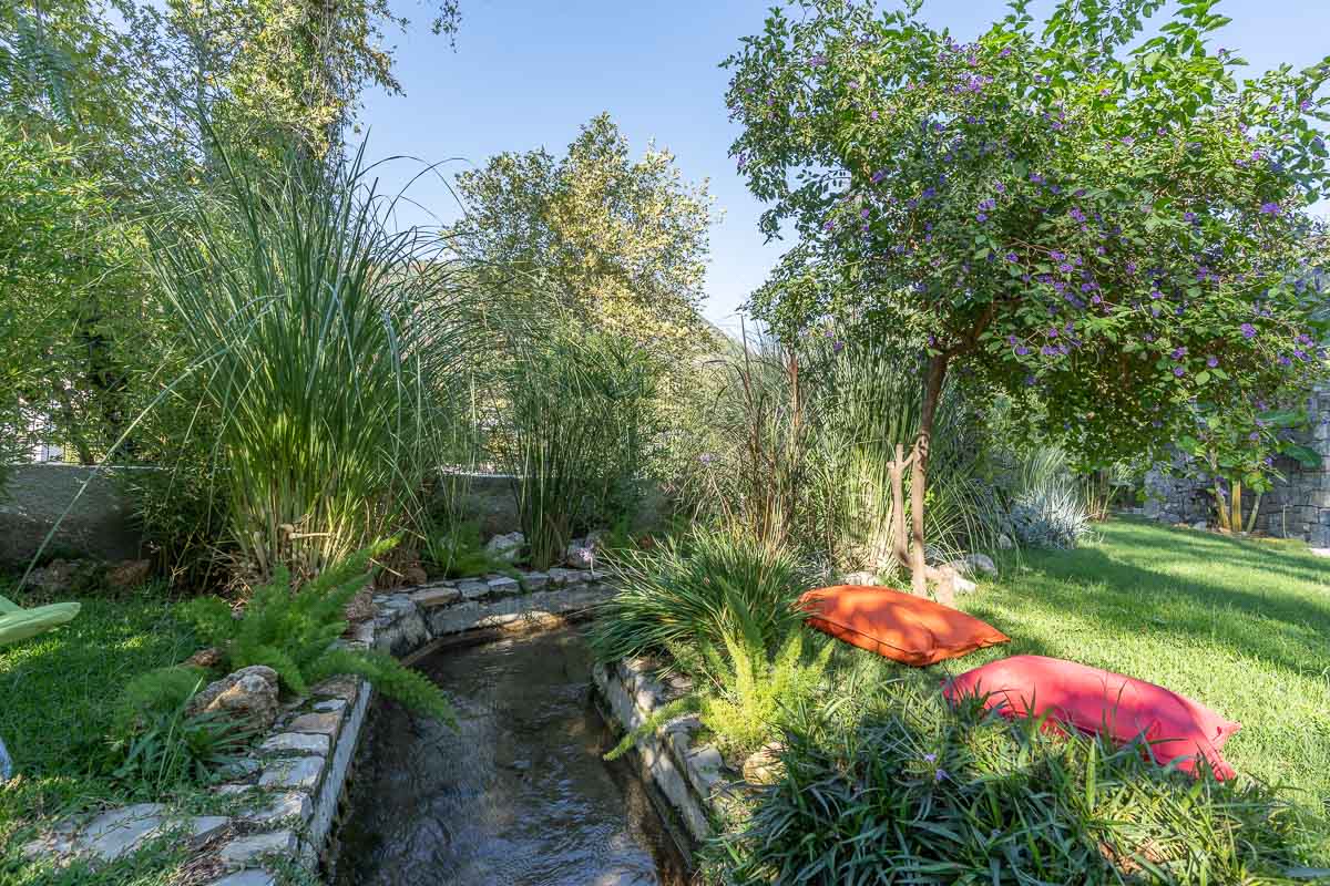 Villanın en dikkat çekici özelliklerinden biri bahçesinden geçen küçük doğal su yolu. Bu doğal akış bahçeyi iki ayrı bölüme ayırıyor. Yaklaşık 500 m² büyüklüğündeki üst bahçe ve 200 m² büyüklüğündeki alt bahçe, peyzaj ve dinlenme alanları açısından farklı kullanım imkânları sunuyor. Bahçe içerisinde yer alan veranda ve hemen önündeki infinity yüzme havuzu, özellikle yaz aylarında oldukça keyifli bir yaşam alanı oluşturuyor.